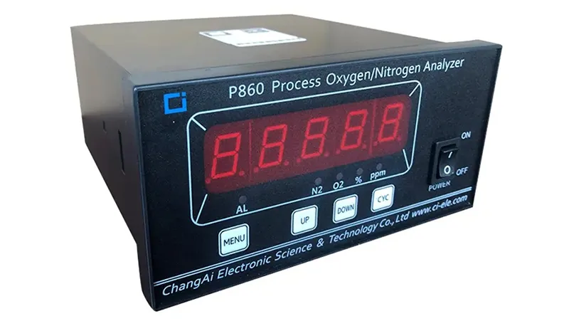 The P860 process oxygen/nitrogen analyzer is an online intelligent measuring instrument equipped with an advanced single-chip ionic current oxygen sensor. It determines nitrogen concentration (N₂%) through the differential calculation of 100% - O₂%. This analyzer is widely used in nitrogen separation from air, fertilizer production, petrochemical processing, and bio-fermentation processes.