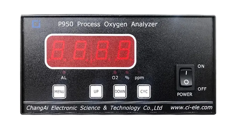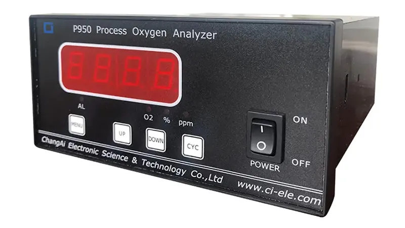 The P950 process oxygen analyzer is microprocessor-based and uses an ionic current oxygen sensor as the measuring element. After signal processing and calculation, oxygen concentration in oxygen-nitrogen mixed gas is displayed. Configurations include alarm setpoints, analog output signals, and switching outputs for user integration.